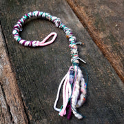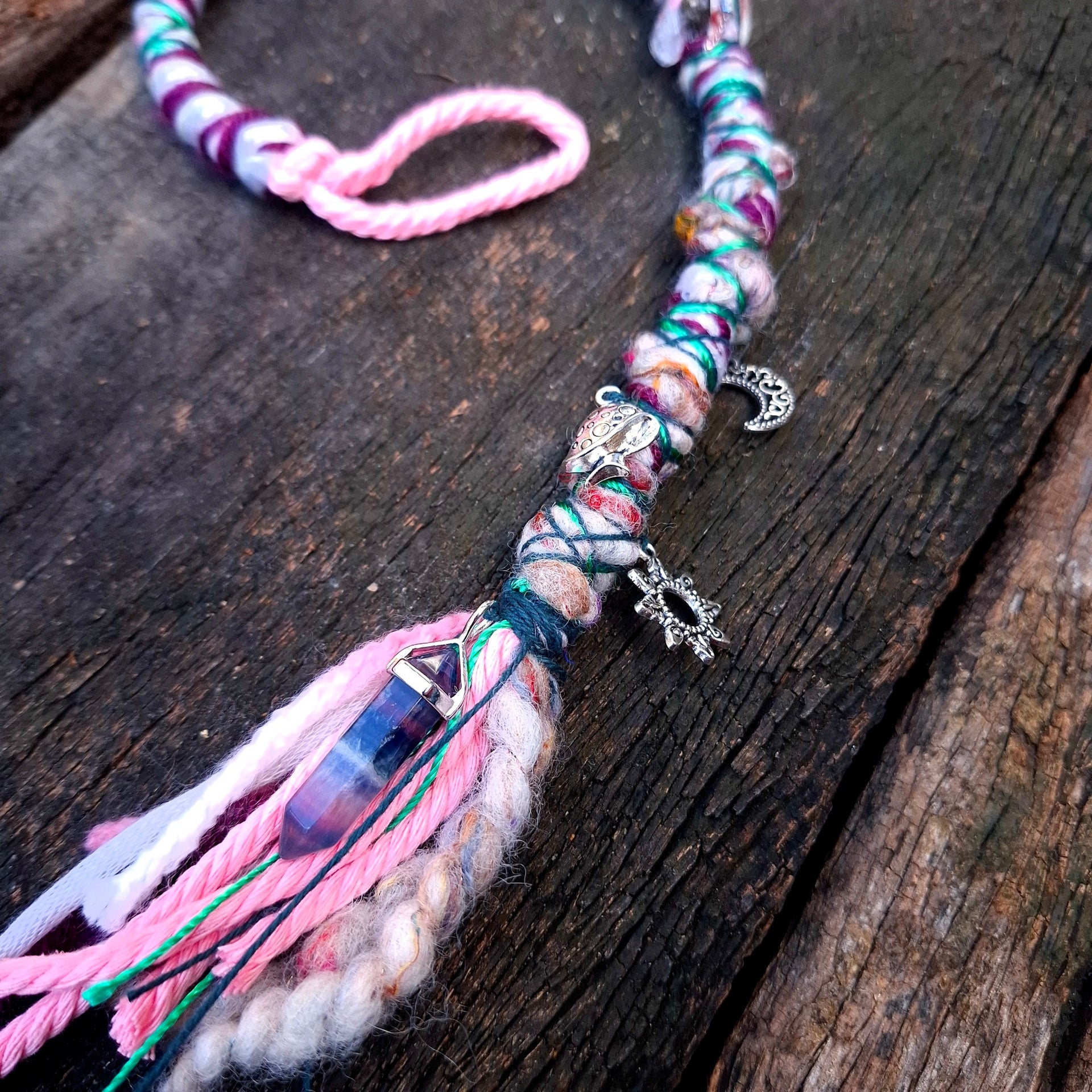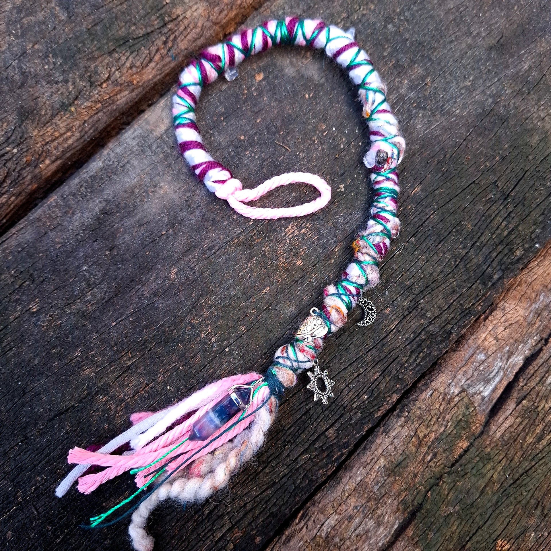 This wrap is made from a blend of pink, purple, green & grey yarns and is decorated with Rutilated Quartz gemstone beads, a variety of silver charms and a banded Fluorite pendant.