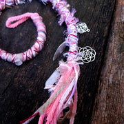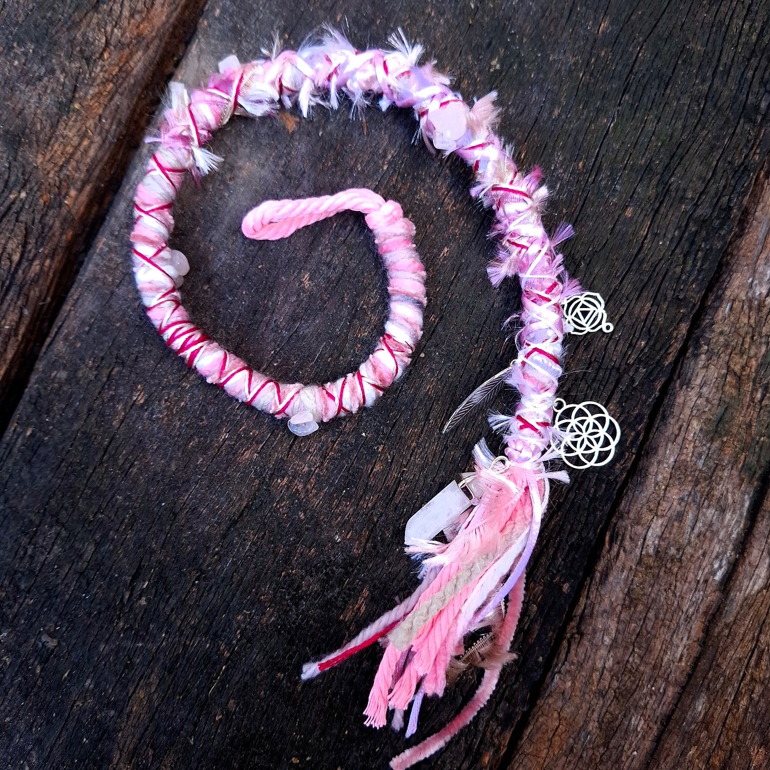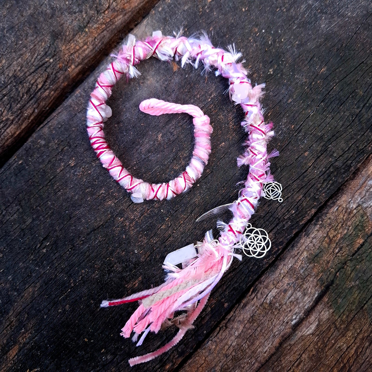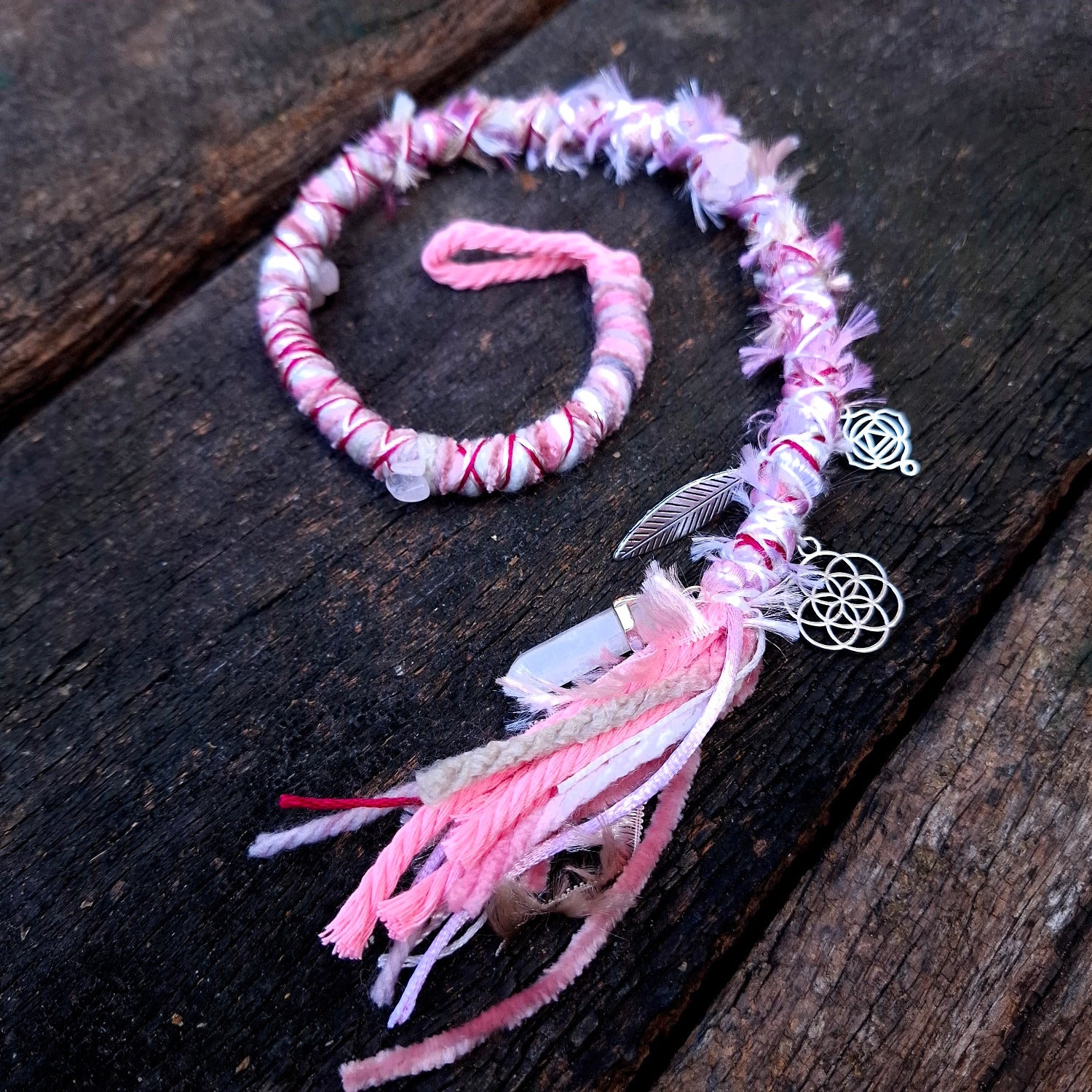 This wrap is made from a blend of pink yarns and is decorated with Rose Quartz gemstone beads, a variety of silver charms and a clear Quartz pendant.