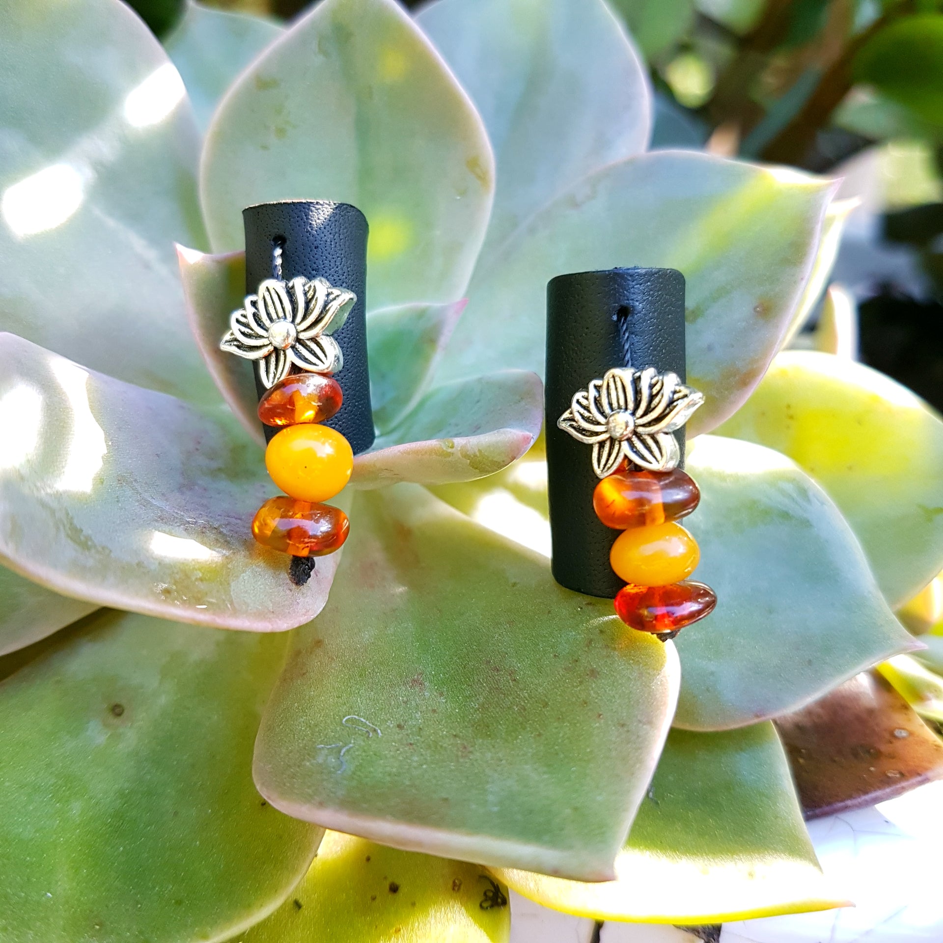 Black leather dreadlock cuff featuring silver lotus flower and baltic amber bead dangle.