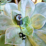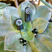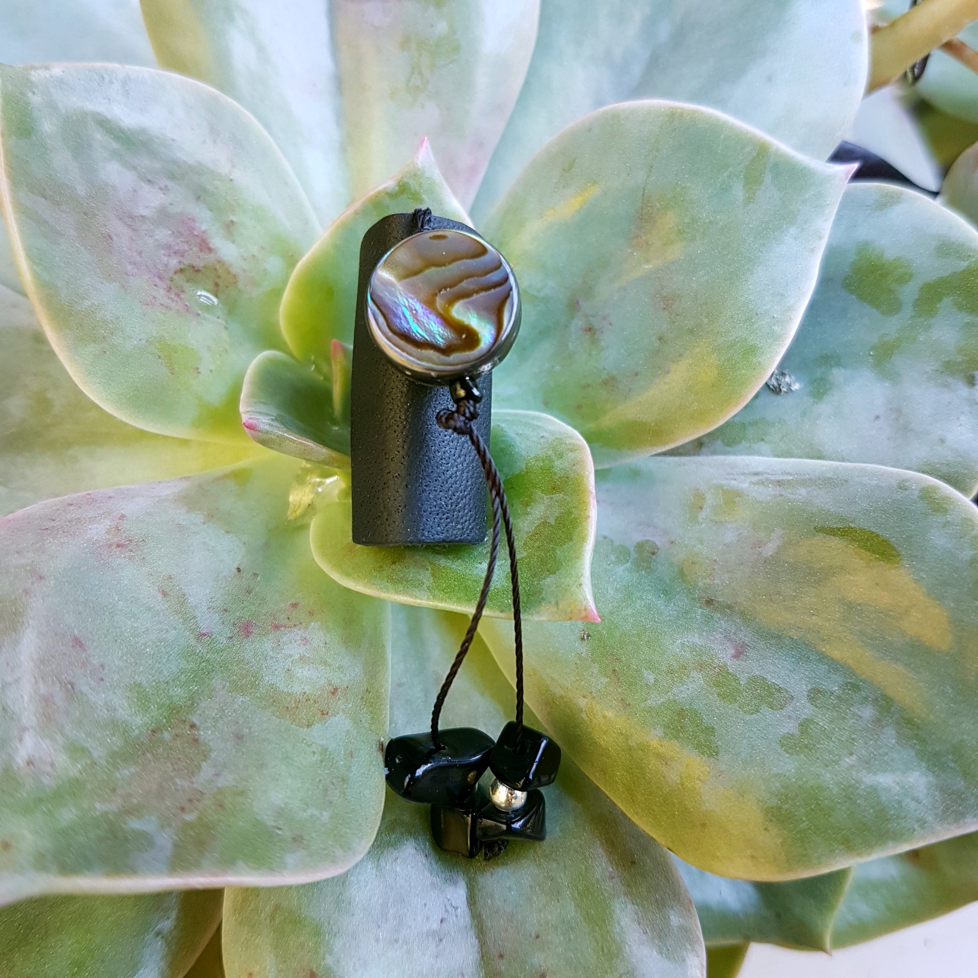 Black leather dreadlock cuff featuring paua shell and black onyx bead dangle.