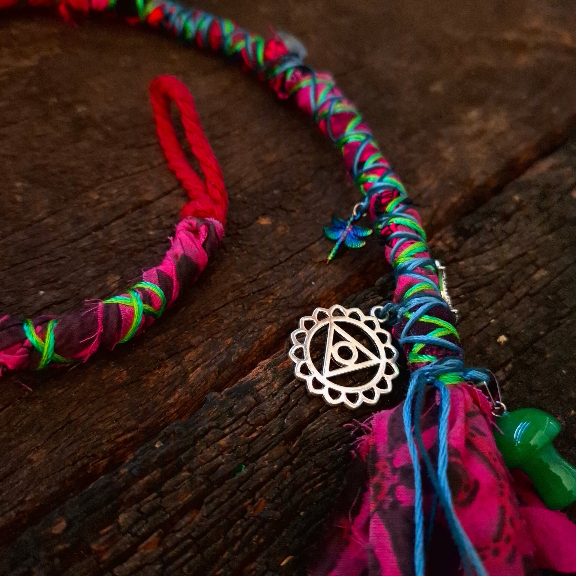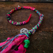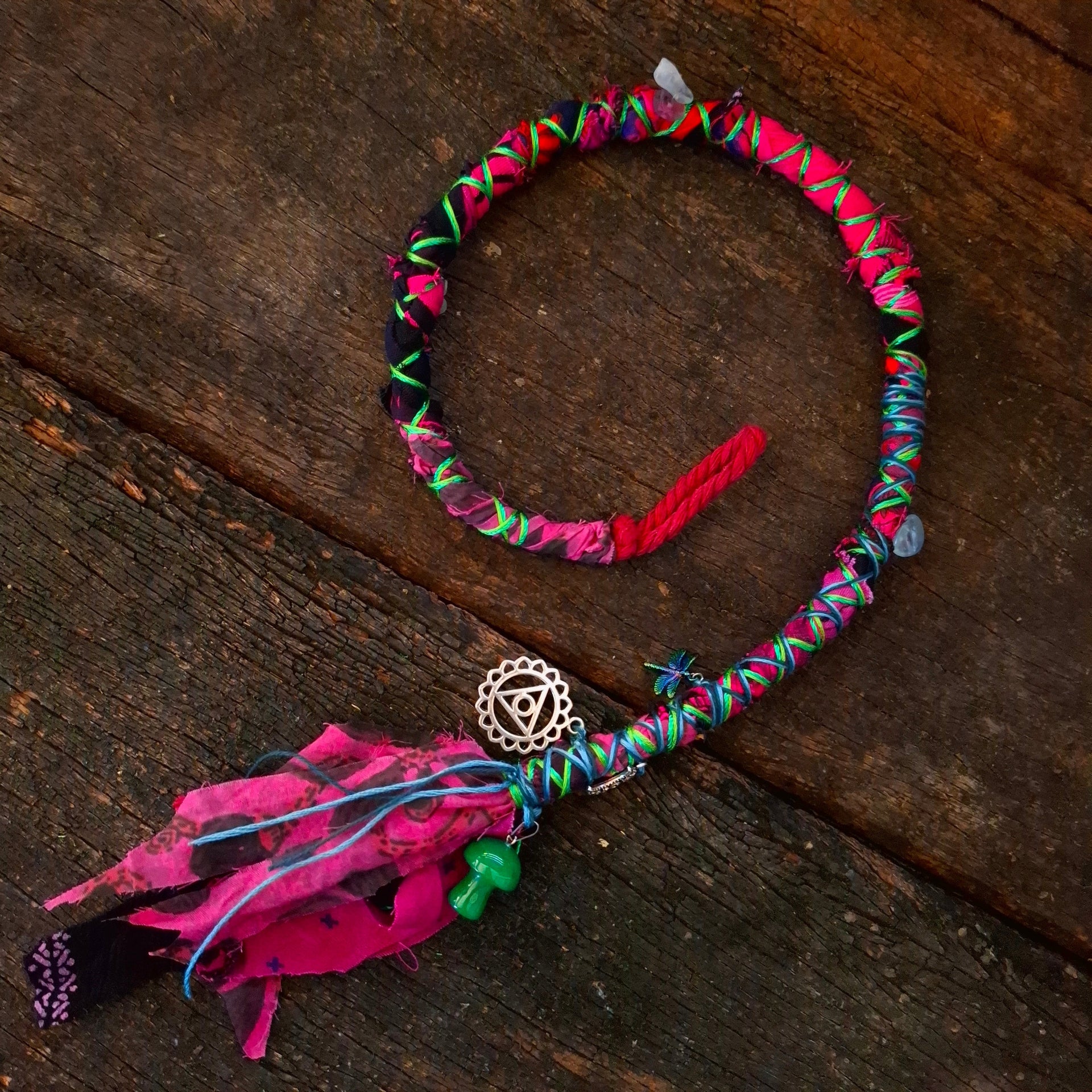 This wrap is made from recycled gypsy fabrics and is decorated with Fluorite gemstone beads, a variety of silver charms and a green crystal mushroom pendant.