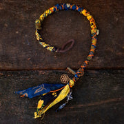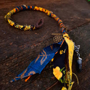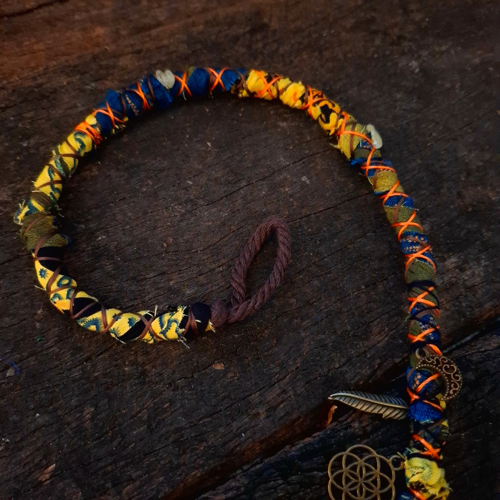 This wrap is made from recycled gypsy fabrics and is decorated with Citrine gemstone beads, a variety of brass charms and a snowflake Obsidian merkaba crystal pendant.