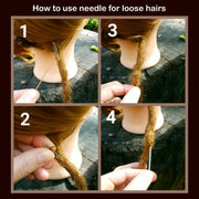 Simply insert the needle downwards along the length of the dreadlock at the starting point on the long hairs you wish to sew in. The eye of the needle should now line up with the loose hair, twist the loose hair to make it easier to thread through the needle eye. Now push the needle down the side of the dreadlock pulling the loose hair in. You may need to repeat this again if the loose hairs were longer than the needle.