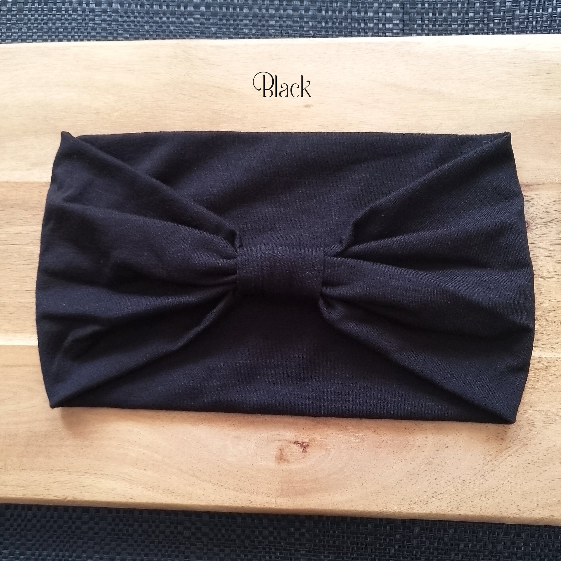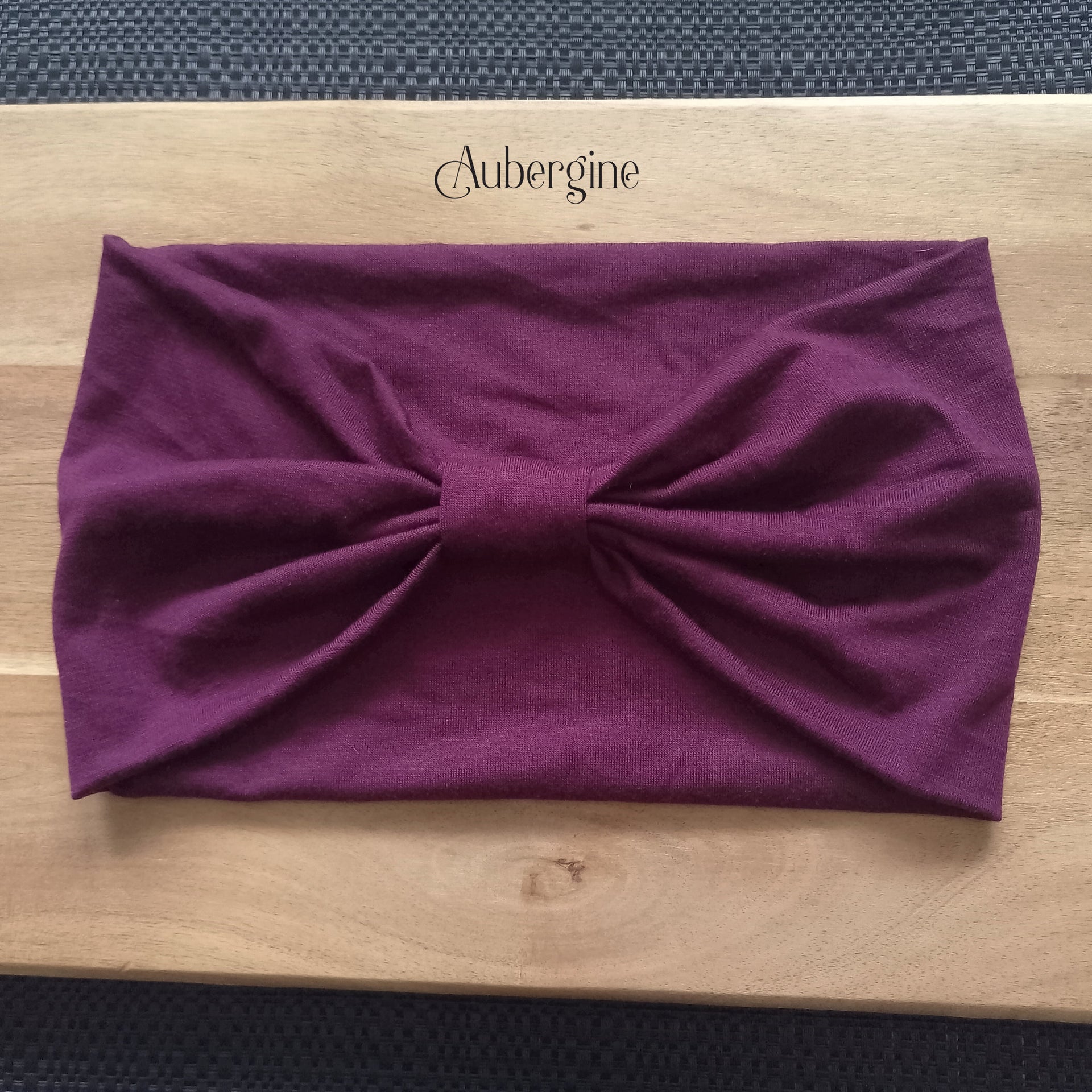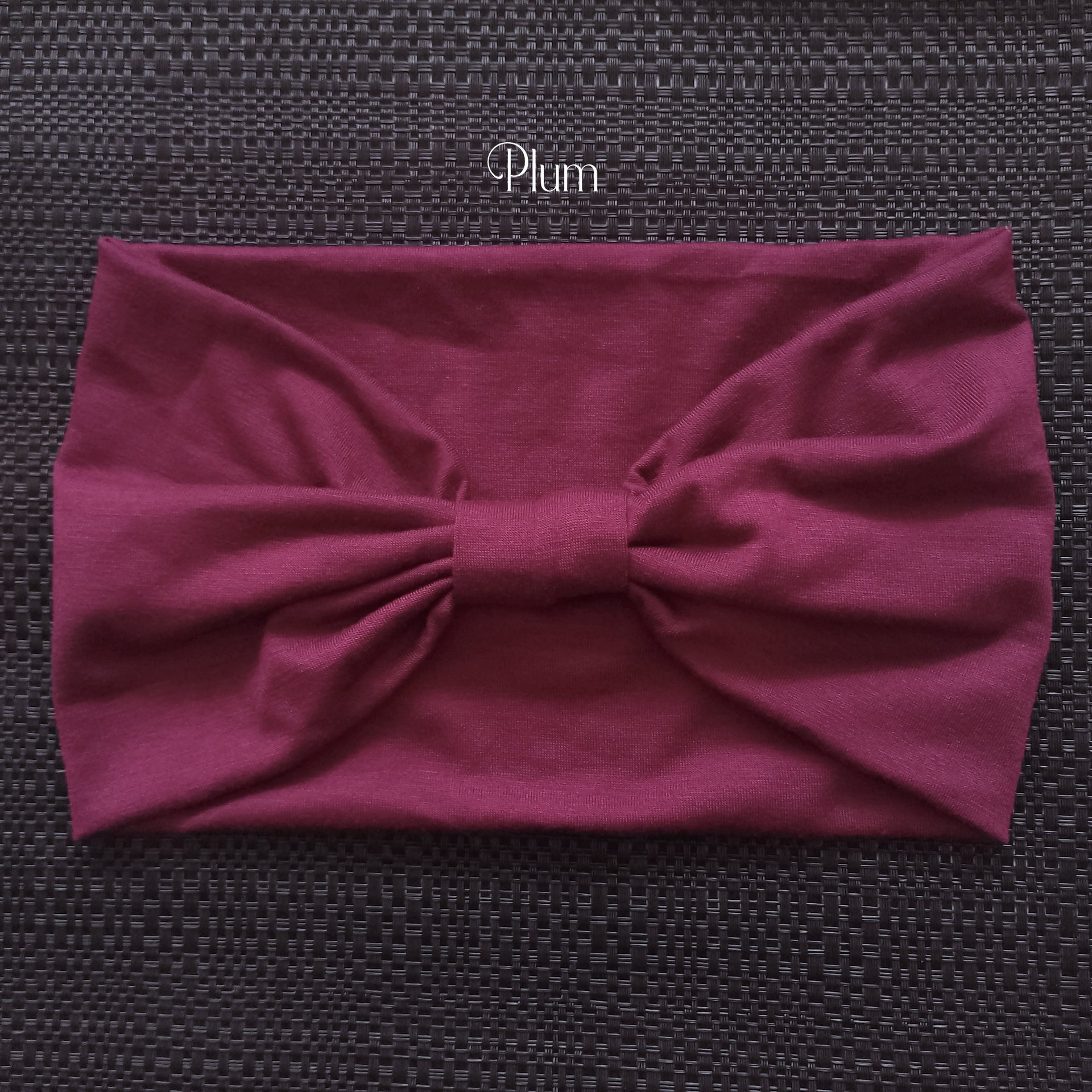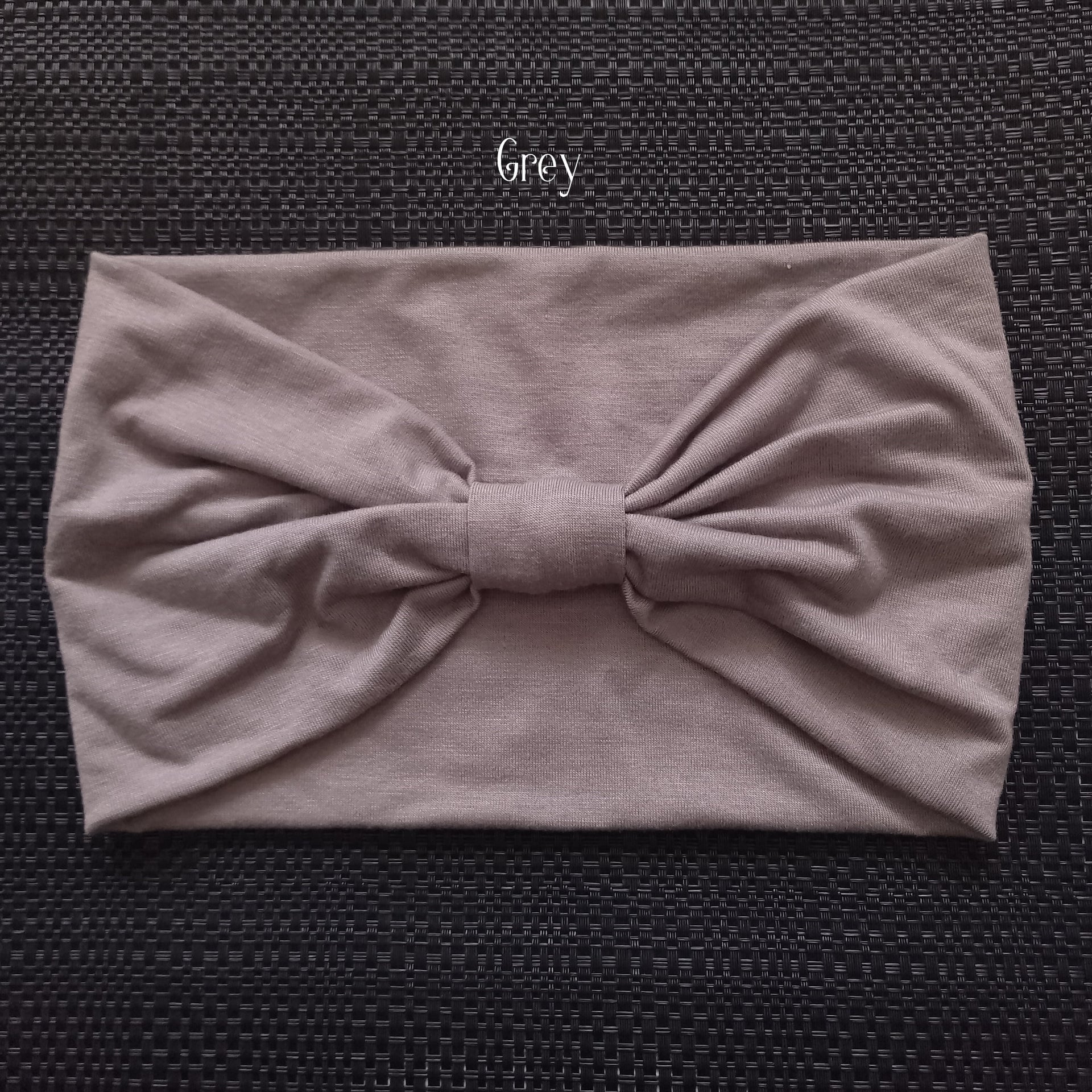 Plain cotton lycra headband with a loop gathering creating a 'knot' effect.  You can wear it with the knot at the front, side or back creating different looks, or the loop can easily be removed if you prefer to have the headband the same width all the way around.