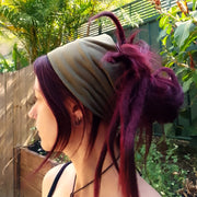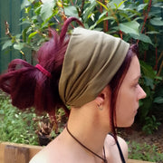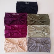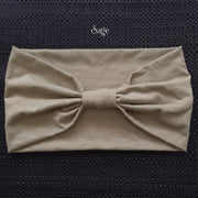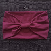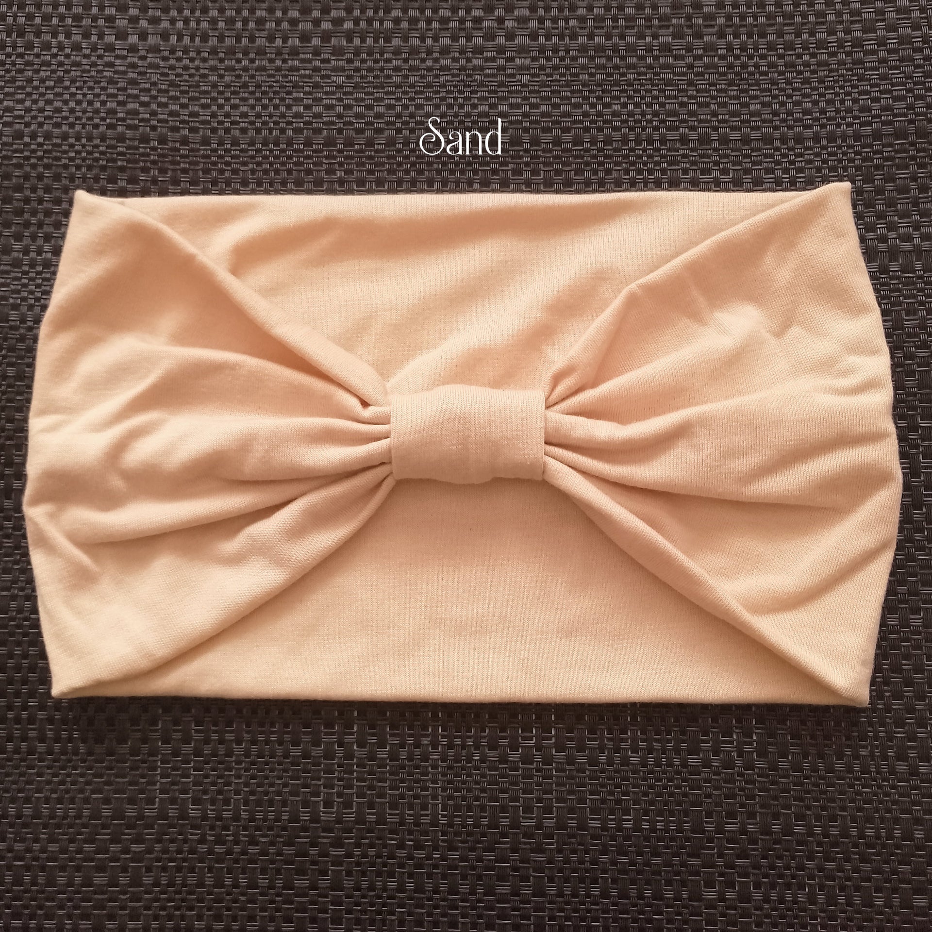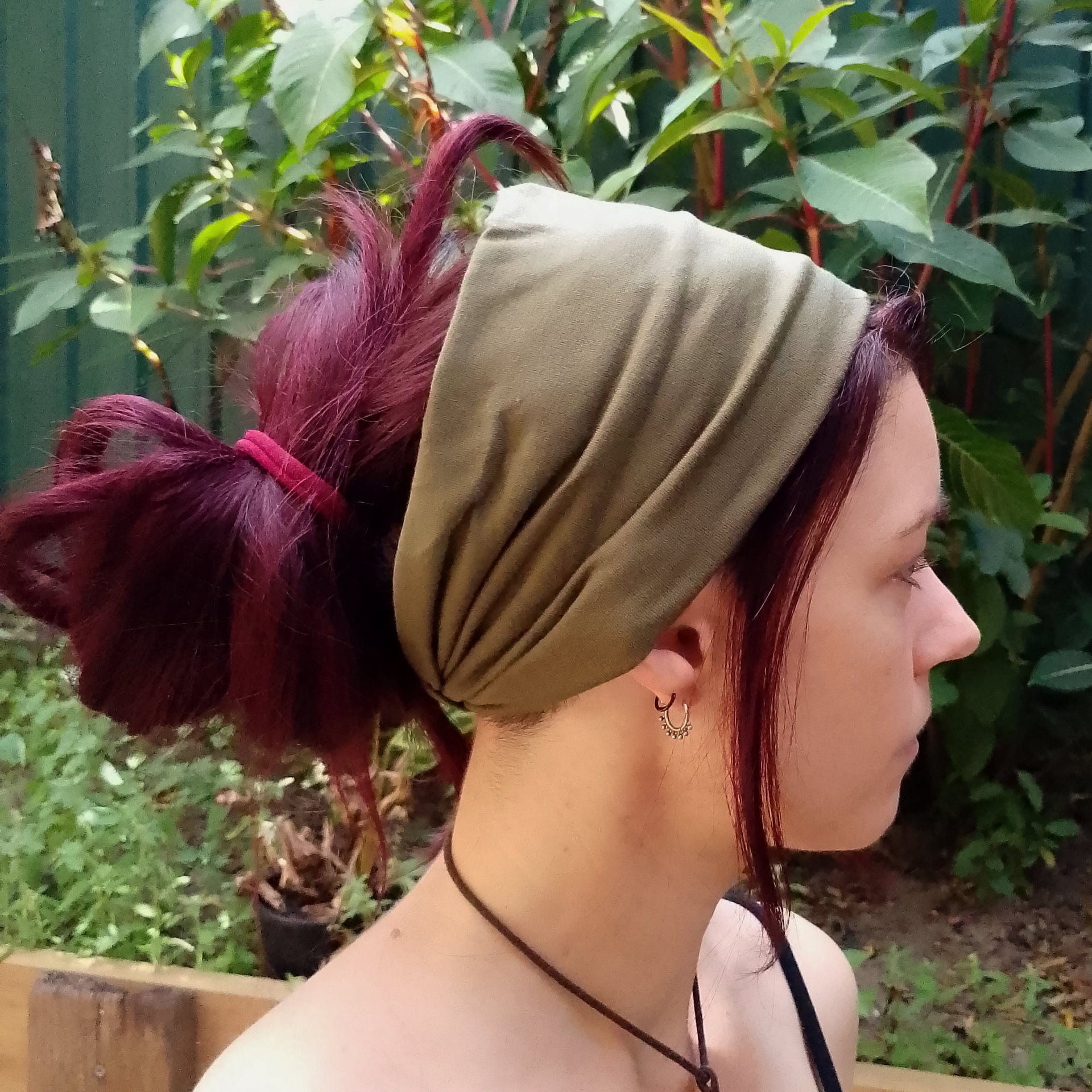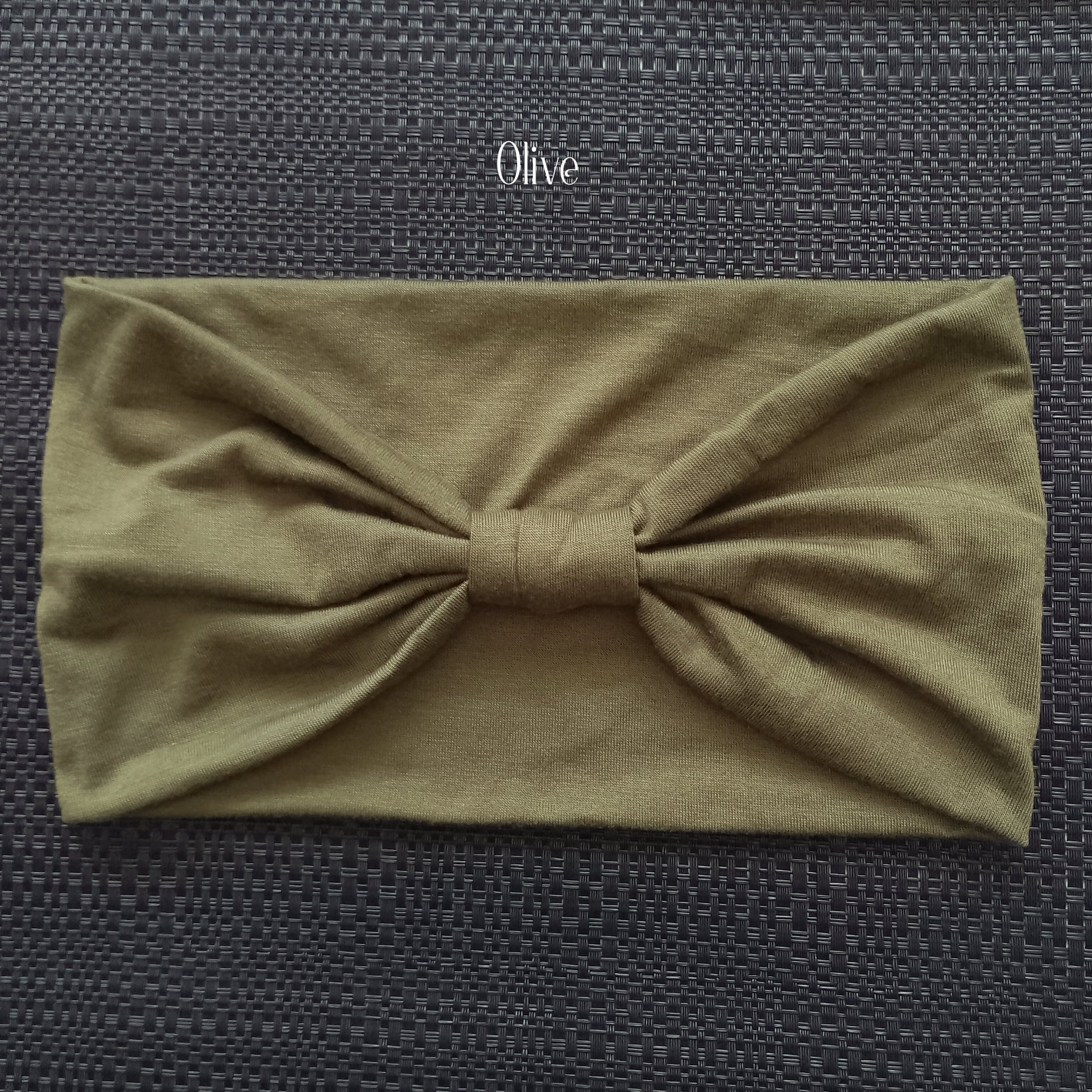 Plain cotton lycra headband with a loop gathering creating a 'knot' effect.  You can wear it with the knot at the front, side or back creating different looks, or the loop can easily be removed if you prefer to have the headband the same width all the way around.