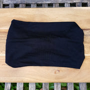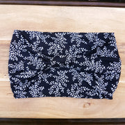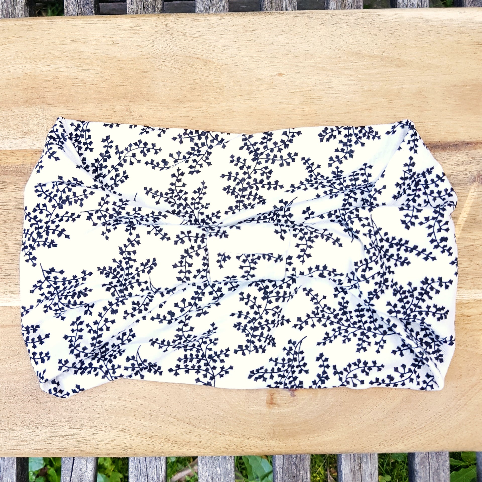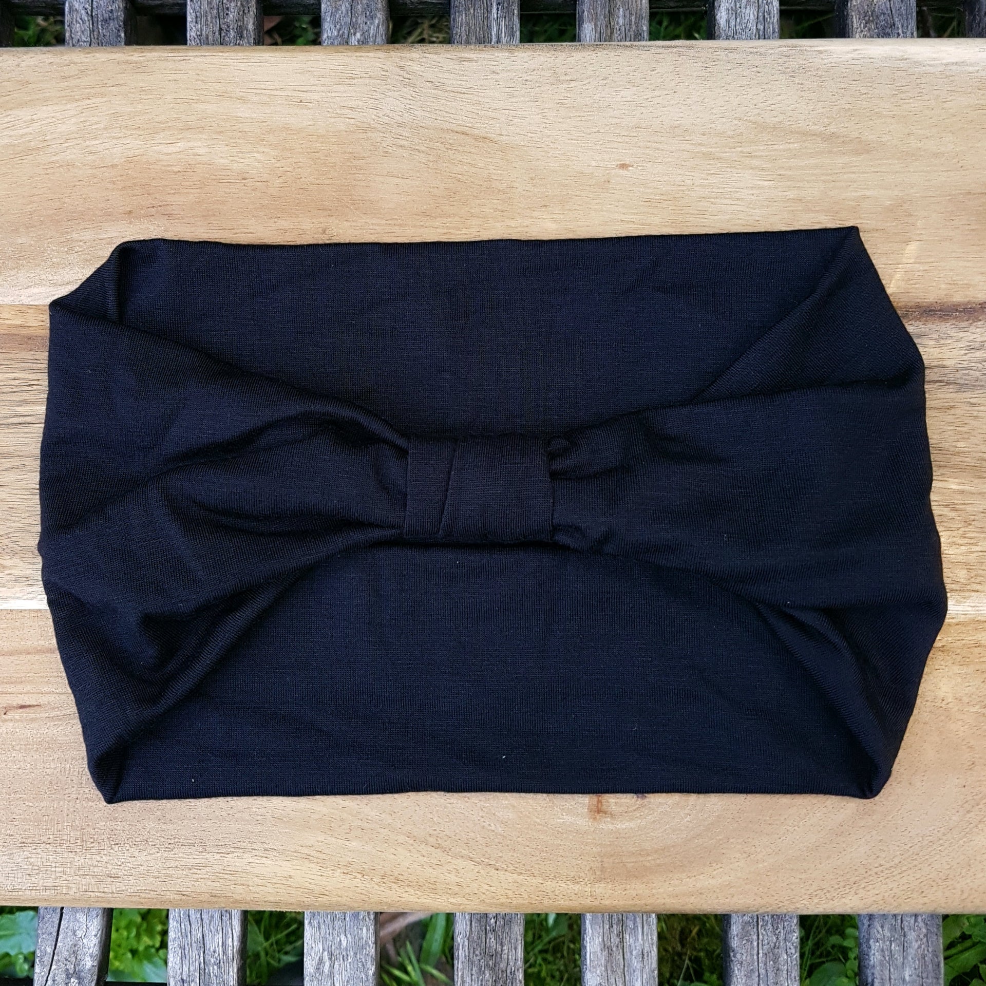 14cm wide with a loop gathering creating a 'knot' effect. You can wear it with the knot at the front, side or back creating different looks, or the loop can easily be removed if you prefer to have the headband the same width all the way around.
