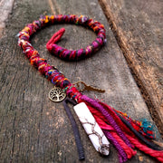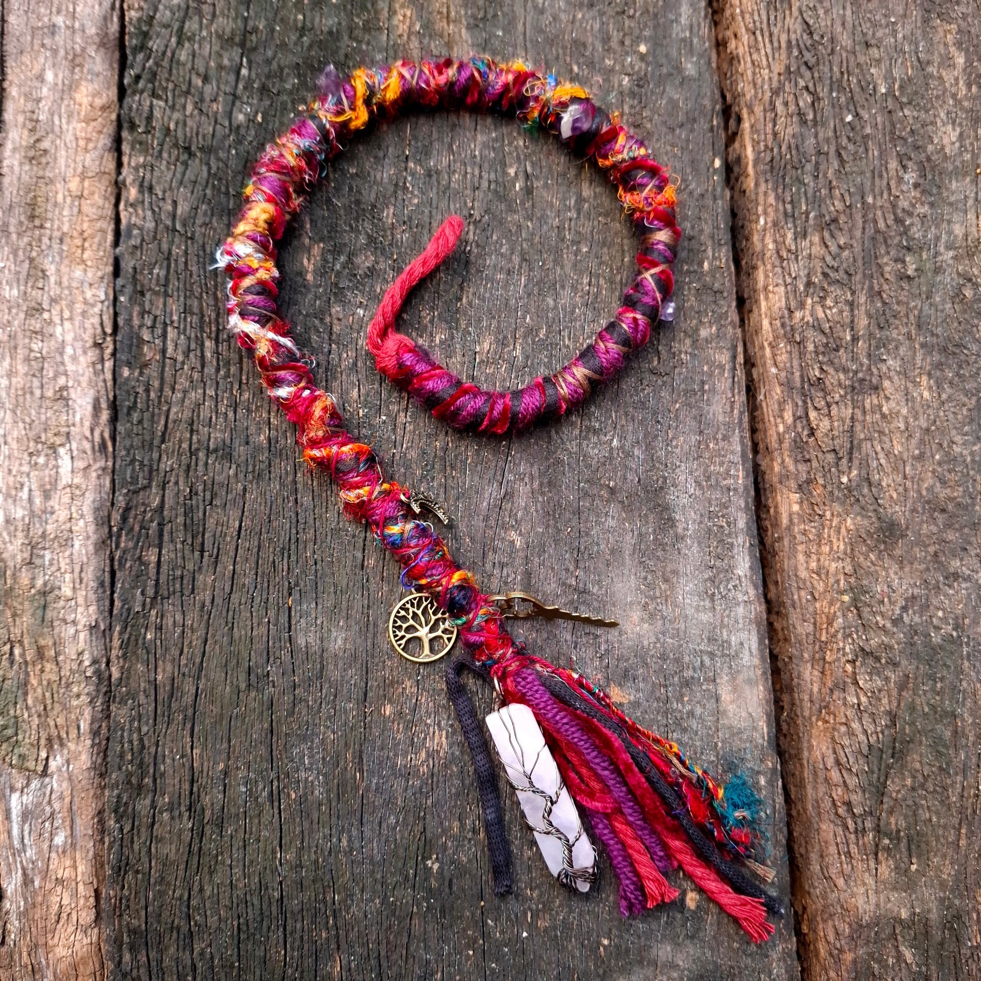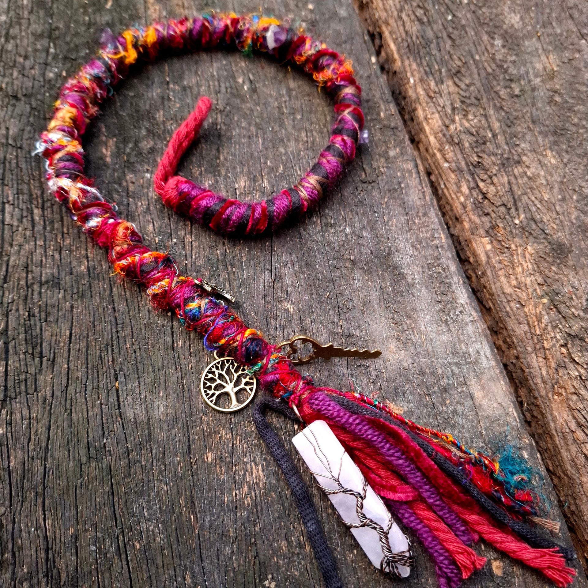 This wrap is made from red, purple, black & sari silk yarns and is decorated with Amethyst gemstone beads, a variety of brass charms and a large Rose Quartz wire wrapped pendant.