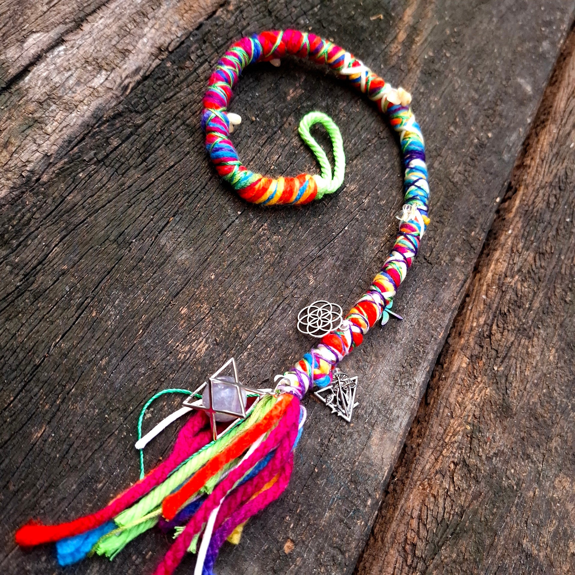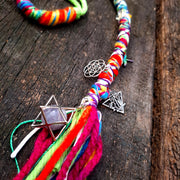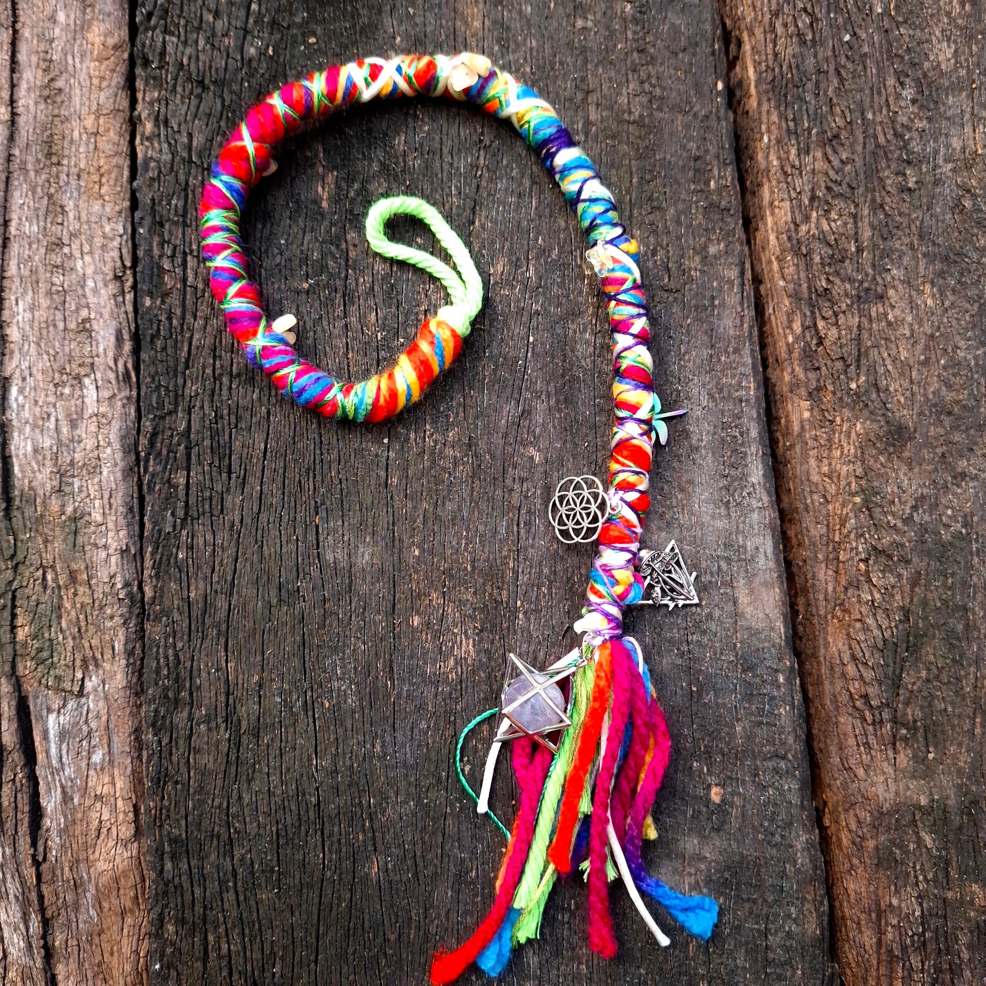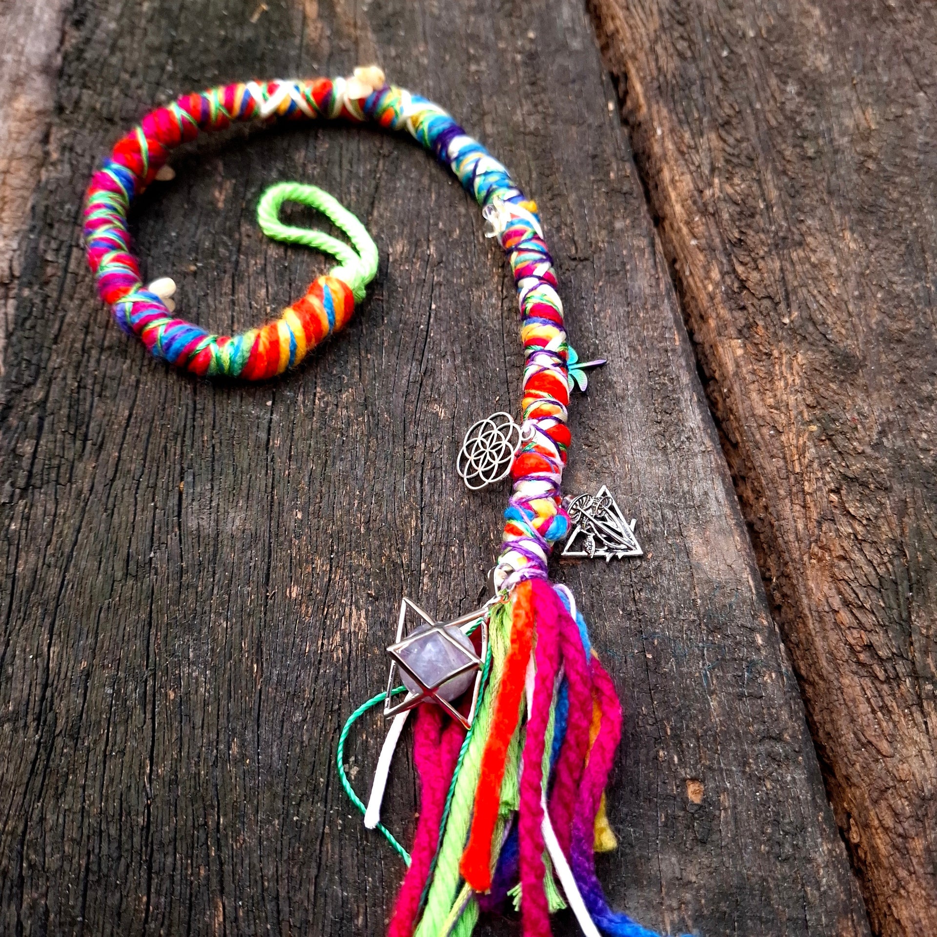 This wrap is made from rainbow coloured yarns and is decorated with Citrine gemstone beads, a variety of silver charms and a Fluorite merkaba pendant.