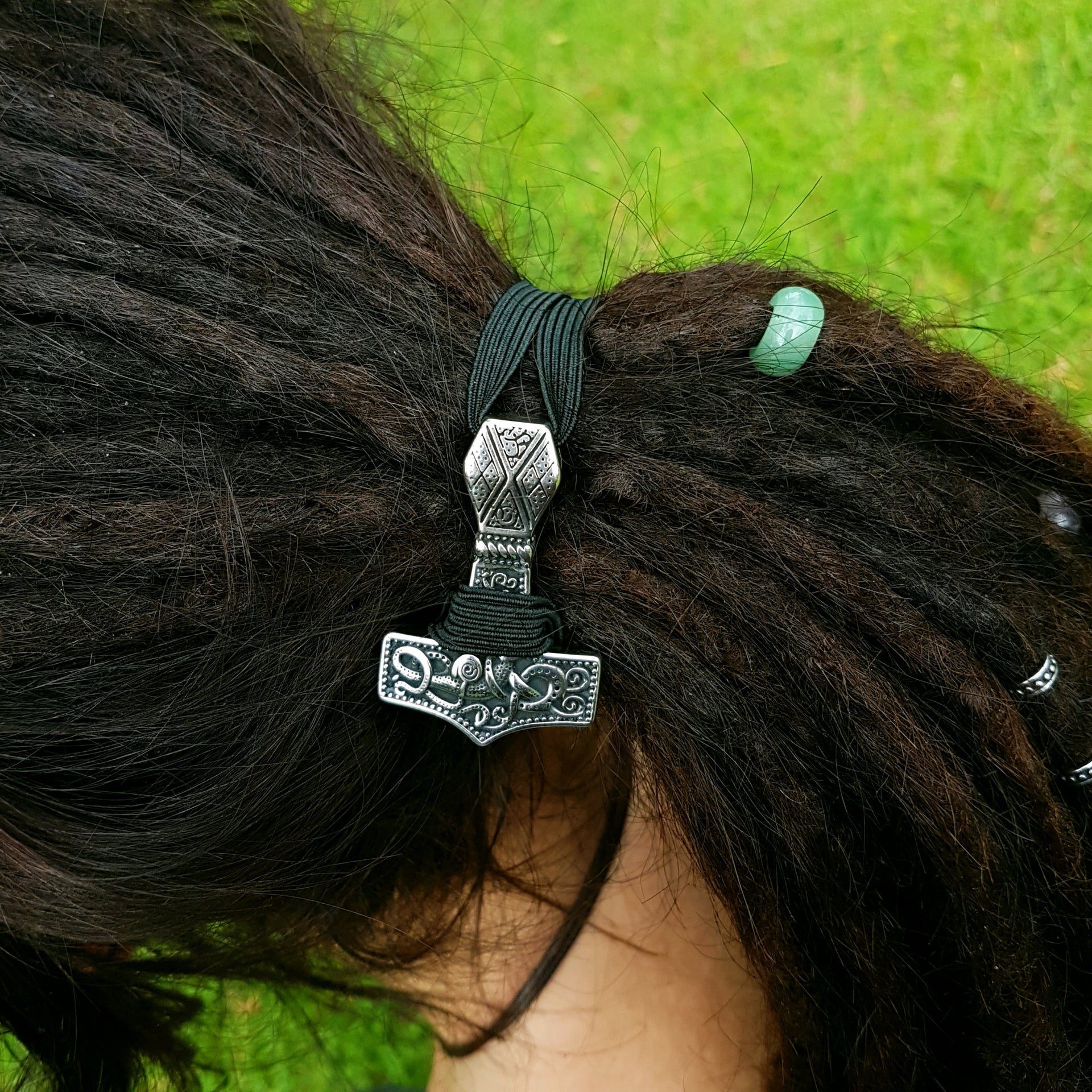 Viking dread tie coffin style buckle with black elastic band that wraps around your dreads and hooks over the buckle to secure.